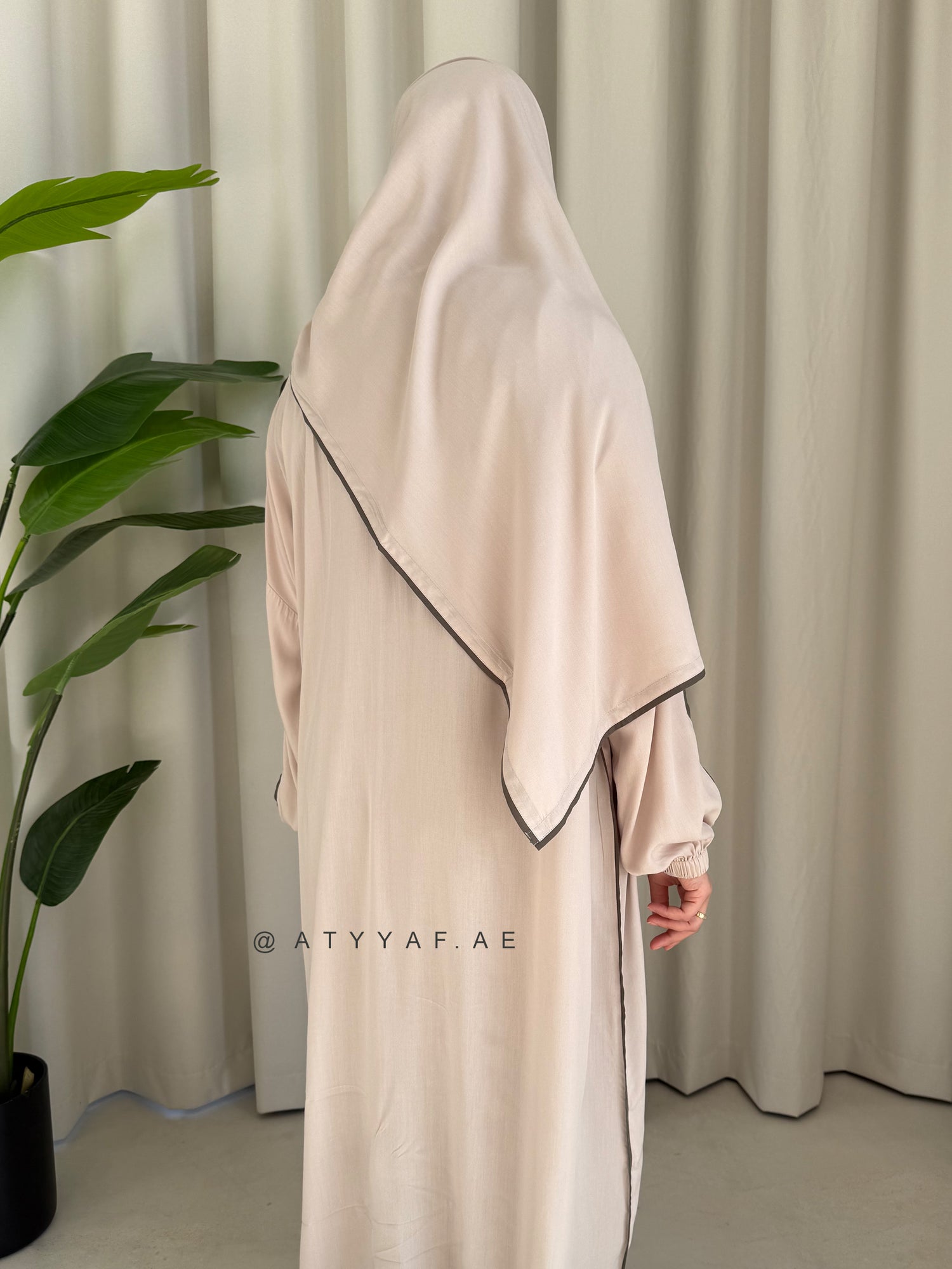 لباس صلاة باللون البيج مغلق و حدود بالاخضر الداكن مع شيلة متصلة و إضافة زرار / بمقاس فري سايز-